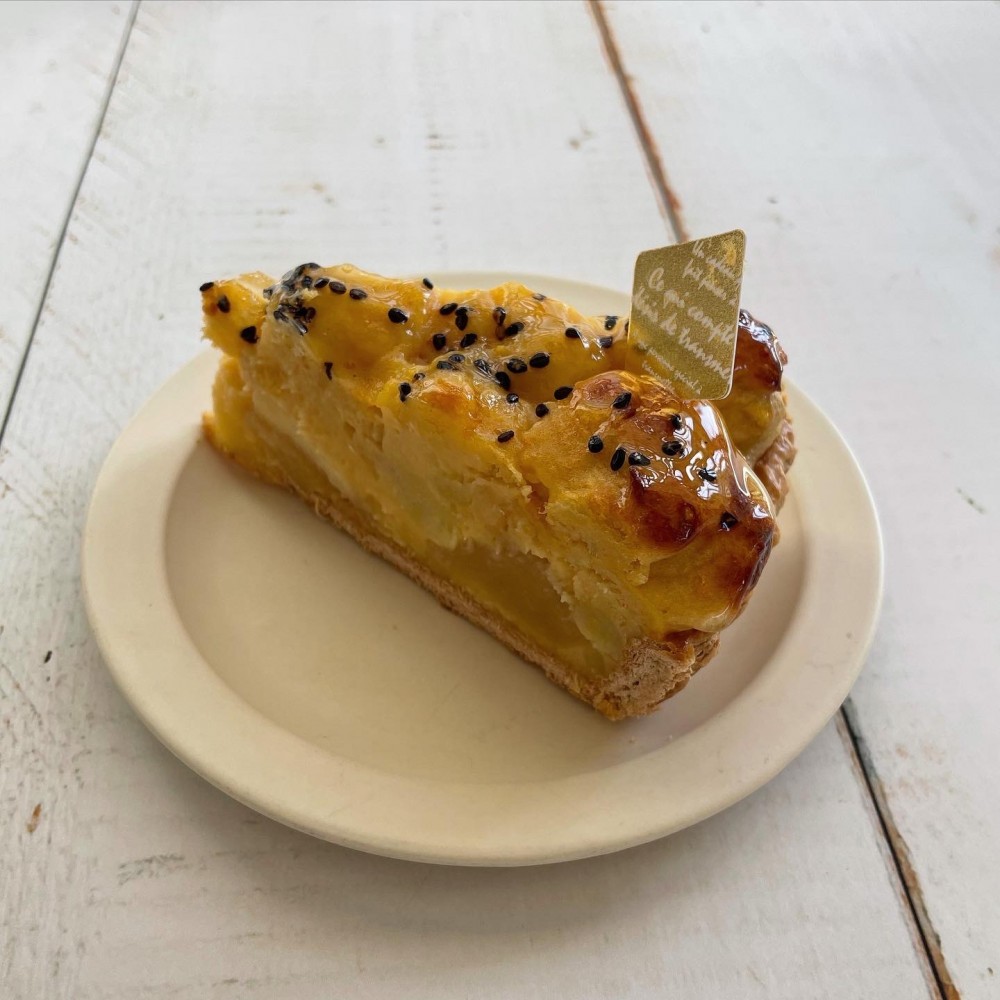 永平寺産のサツマイモ(紅はるか)を使ったスイートポテトにりんごのコンポートがいいアクセント!!!パイ生地仕立ての秋の限定タルト。