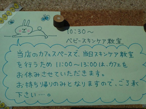 カフェスペースにて午後1時まで【ベビースキンケアのお教室】を開催中の為、