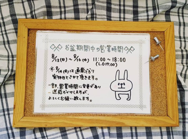 また、お盆の8/15(火)・8/16(水)平日ではございますが、営業時間11:00~18:00とさせて頂きますのでご了承下さい。