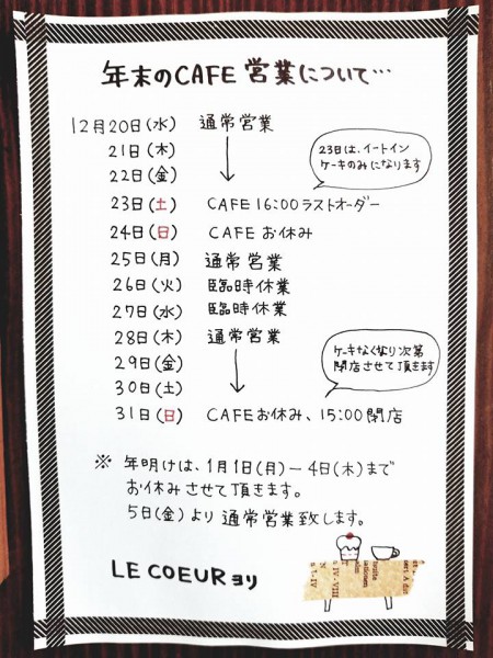 X'mas期間と年末のカフェ営業ですが、時間の縮小やお休みさせて頂くお日にちが一部ございます(;;)