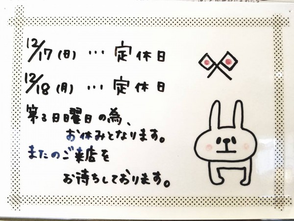 今月は通常の定休日に加え12/26(火)・12/27(水)を臨時休業とさせて頂きます。