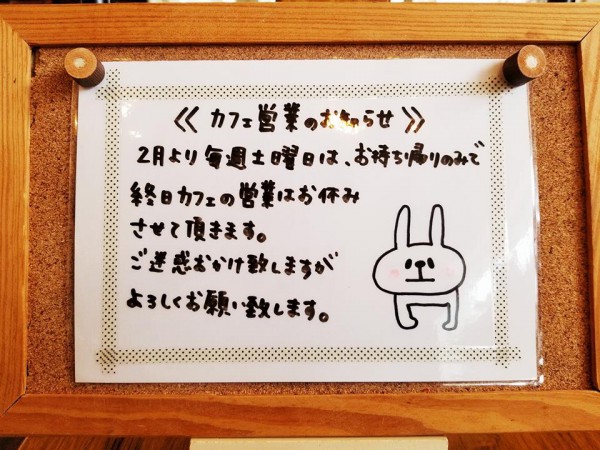 2月より毎週土曜日は、お持ち帰りの販売のみで、カフェの営業はお休みさせて頂きます。