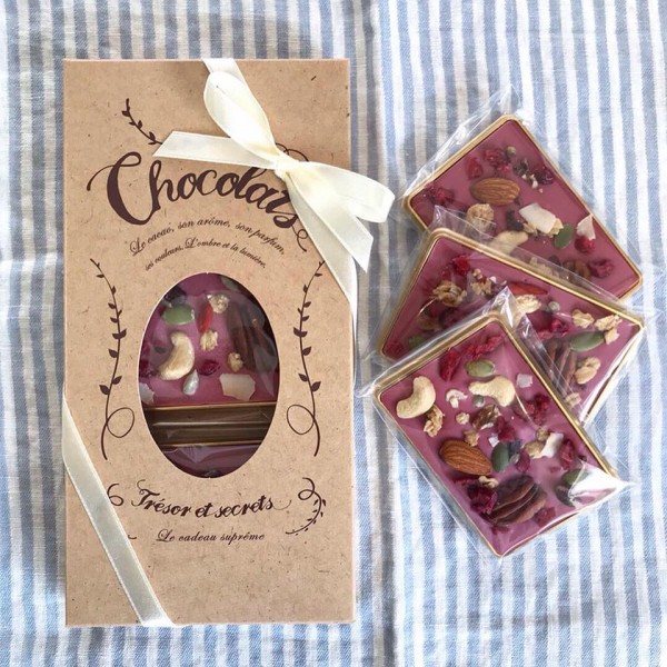 その、ルビーチョコレートを使用し、当店オリジナルのタブレットチョコに仕上げました。 ナッツやドライフルーツがトッピングした贅沢なチョコレートでございます✧