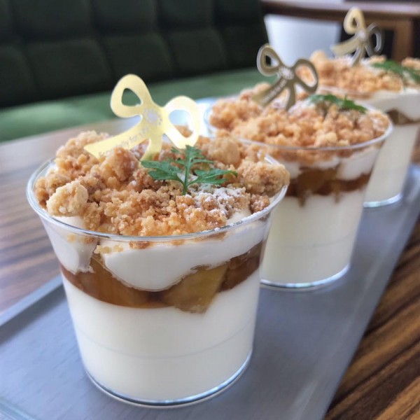 なめらかでクリーミーなパンナコッタ。りんごのカラメルソテー。生クリームにクランブルをトッピング‼︎おいしい層の欲張りスイーツ☆