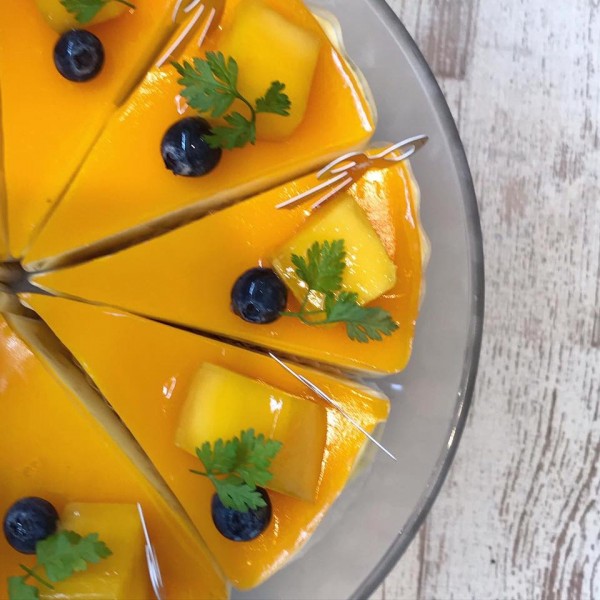アルフォンソマンゴーピューレを使用したマンゴーレアチーズとプレーンのレアチーズ。二層のトロピカルなレアチーズケーキです。 ※飾りはタイマンゴーです。