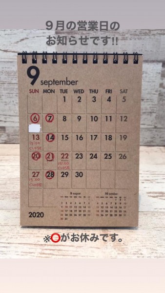 9月の営業日のカレンダー、ご参考に宜しくお願い致します。