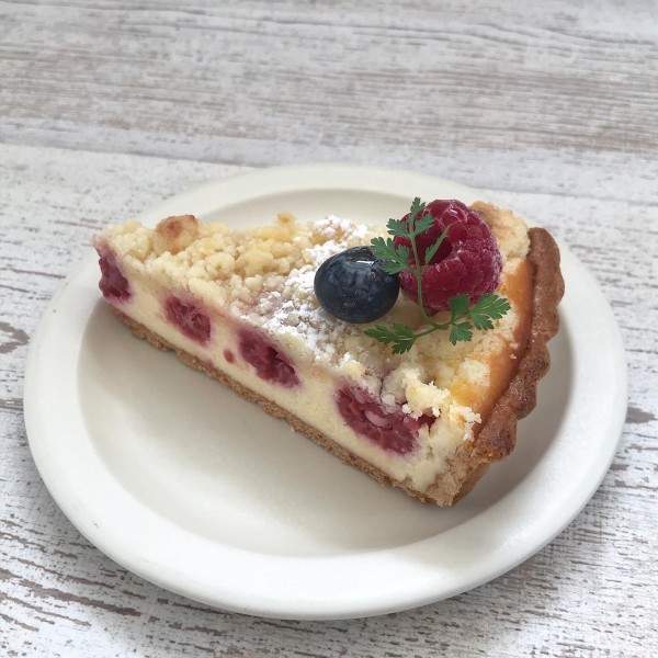 甘酸っぱいラズベリーとほろほろ食感のシュトロイゼルがアクセントのチーズタルトです。