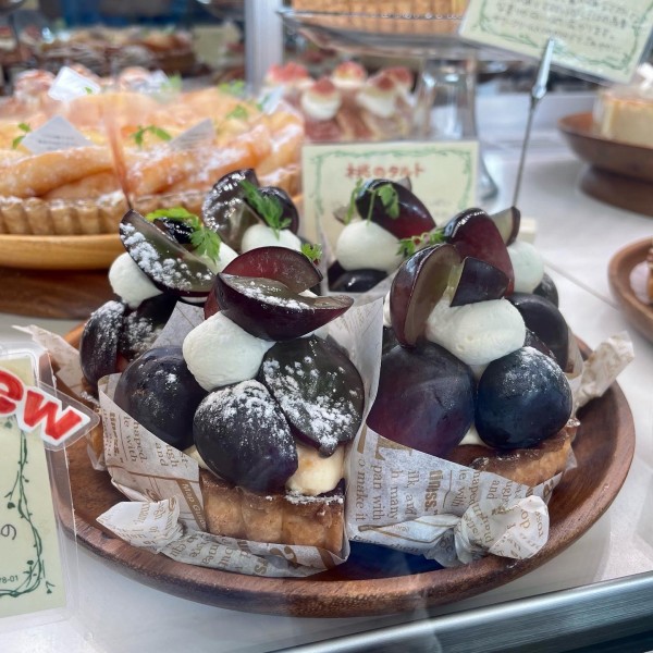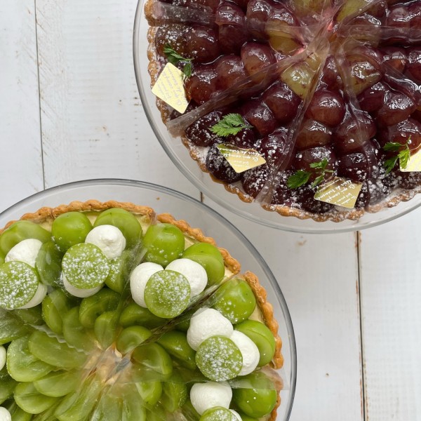 旬のぶどうのタルト、どちらも甘さ控えめのブリゼ生地(パイ生地)で、素材を引き立たせくれてます◎