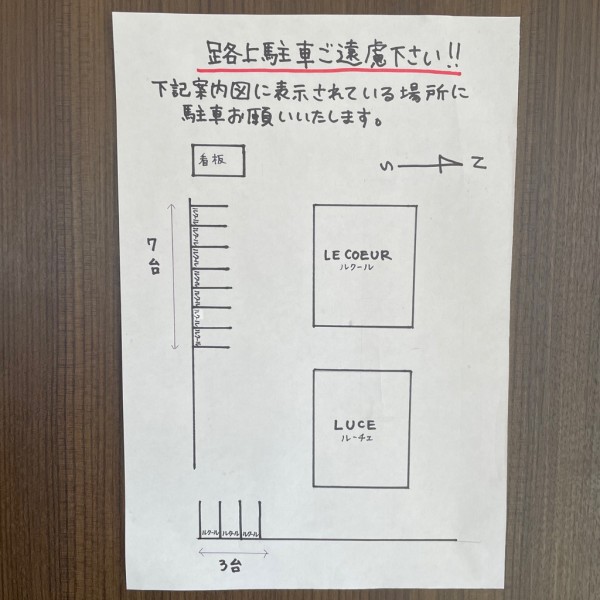 案内図に表示されているルクールの場所に、駐車宜しくお願いします。