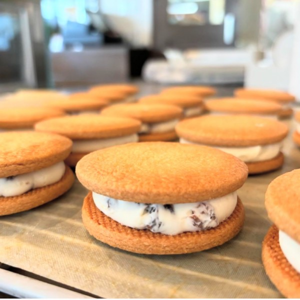 ラムレーズンバタークリームを厚焼きのクッキーでたっぷりではさんだ、【ラムレーズンバターサンド】が、今ある分で終了します。
