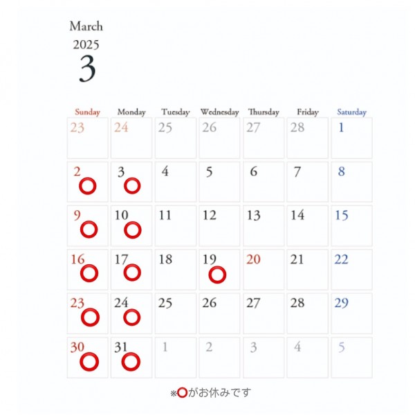 カレンダーを参考に、ご来店・ご予約お待ちしております。
