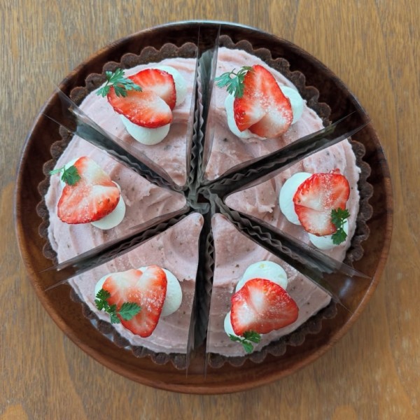 きなこのシュクレ(クッキー生地)に抹茶のダマンド(アーモンドクリーム)を敷き詰めたタルト。いちごと桜あんクリームを合わせました。どこか桜もちっぽさを感じる、和のテイスト。中のいちごの甘酸っぱさが時折出てきてナイスバランス‼︎