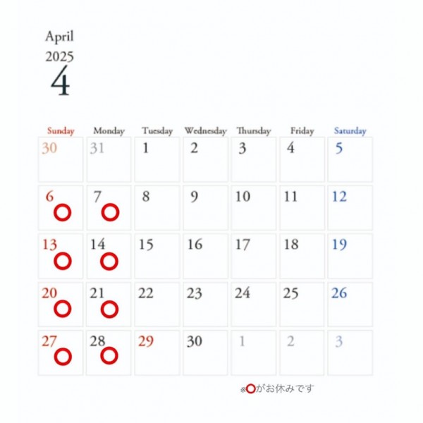 カレンダーを参考に、ご来店ご予約宜しくお願いします。